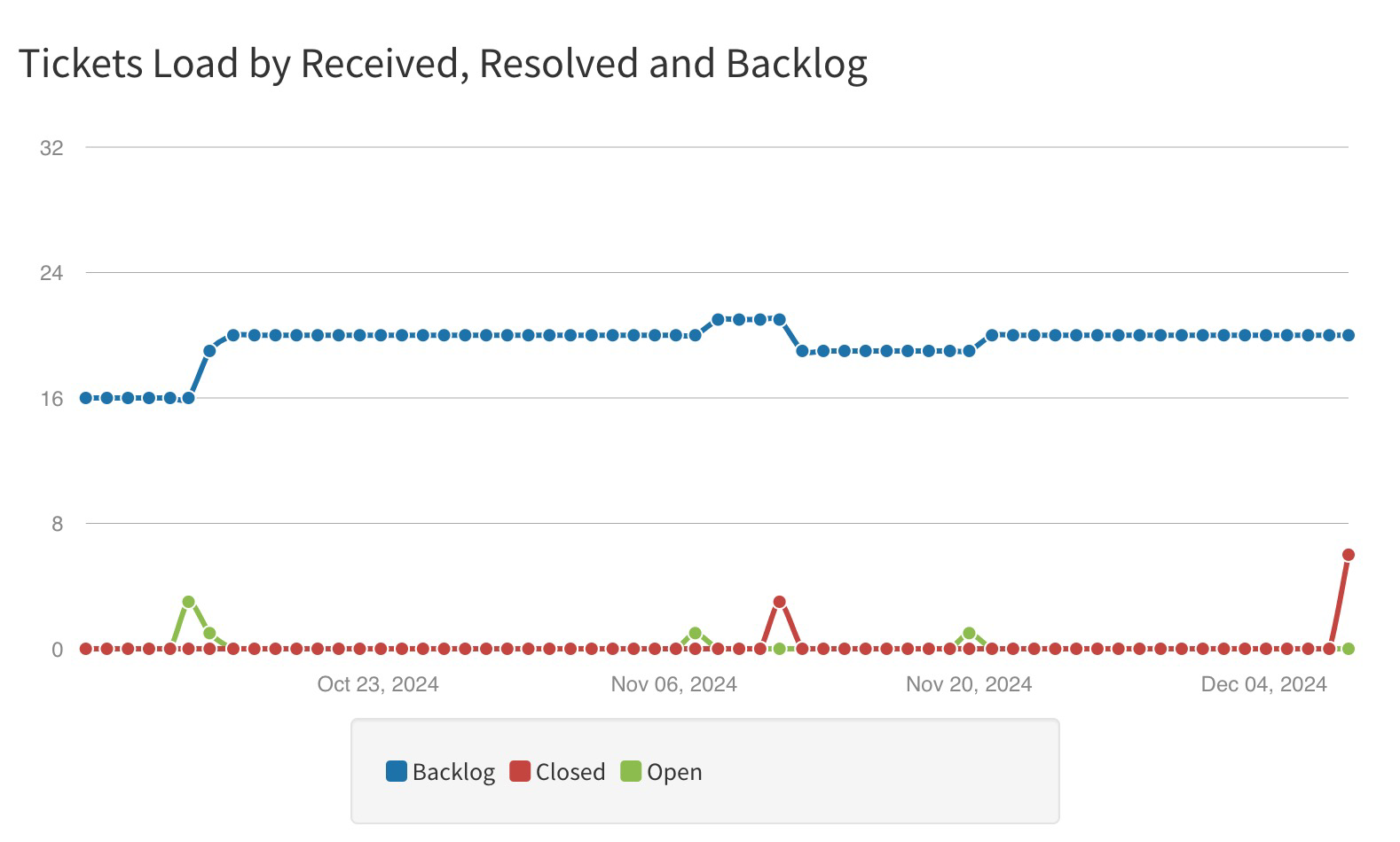 For example, this operational report on Atera displays the daily count of tickets that were opened, closed, and left in the backlog over a specified period.